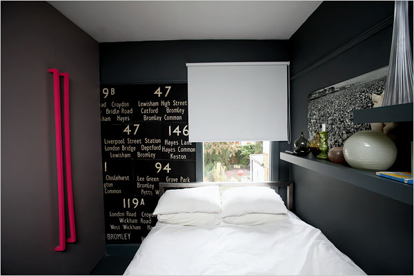 Vem har sagt att alla britter gillar blommigt? Här ett häftigt alternativ, med samma blygrå färg på väggar och golv plus några få, välvalda, klara accentfärger. Allt i en enrummare för två personer, på övervåningen i ett litet hus utanför London.